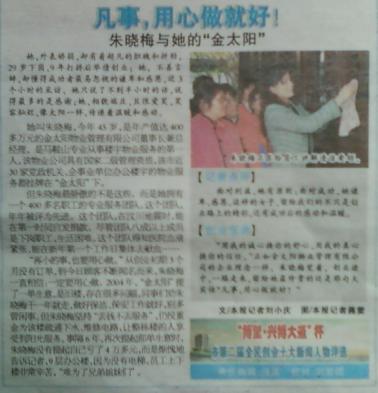 “用我的誠(chéng)心換你的舒心,用我的真心換你的信任?!闭缃鹛?yáng)物業(yè)管理有限公司的企業(yè)理念一樣,朱曉梅覺著,創(chuàng)業(yè)途中,一路走來(lái),留給她最珍貴的還是那句大實(shí)話“凡事,用心做就好!”